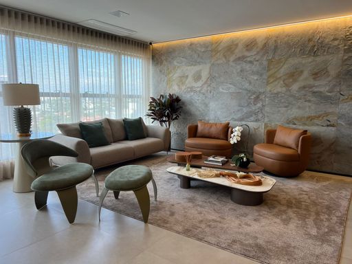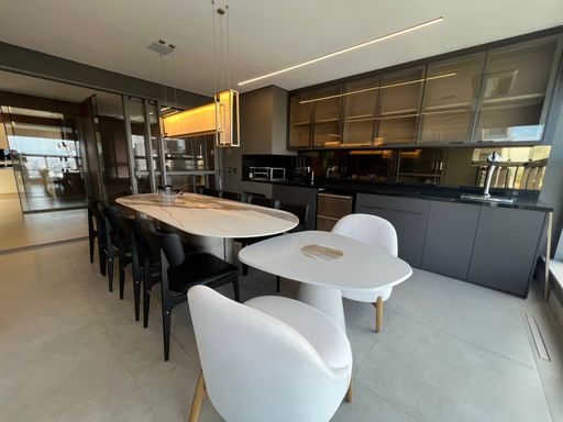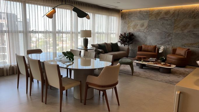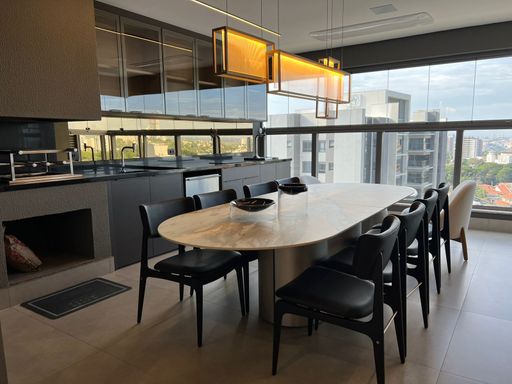 Living para dois ambientes, estar e jantar com moderna decoração. Varanda Gourmet com marcenaria, equipada com choperia, Cooktop de indução, churrasqueira e mesa para 10 Lugares.
