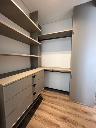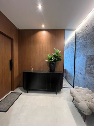Apartamento Altissimo Padrão Mobiliado e Decorado - móveis de assinatura com belíssimo Hall de entrada decorado com aparador, espelho, revestido em madeira e porta com fechadura digital.