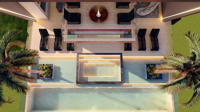 O projeto foi pensado de maneira que desse imponência e ao mesmo tempo leveza e sofisticação. Na fachada temos essa sutil inclinação da estrutura. No acesso da casa, temos um pé direito duplo que contempla uma escada central com um lindo espelho d água, que é um marco, trazendo assim uma forma simétrica para a casa.