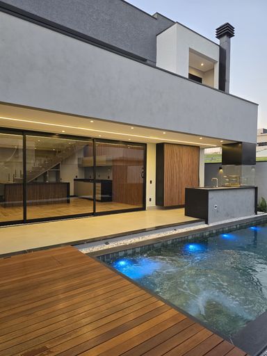 Com área construída de 271m², esta casa possui 3 suítes, lavabo, escritório, cozinha americana, lavanderia, sacada e muito mais. Além disso, conta com isolamento e aceita pets. A área de lazer é completa, com piscina, churrasqueira, varanda gourmet, jardim vertical com plantas naturais e chuveirão. A suíte master possui planejados e acesso a closet e banheiro por porta invisível ripado.