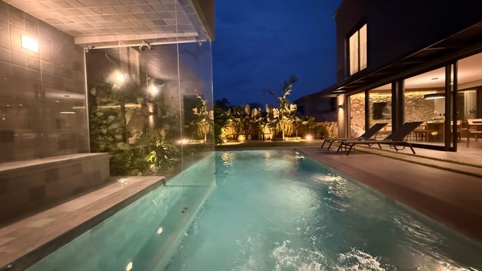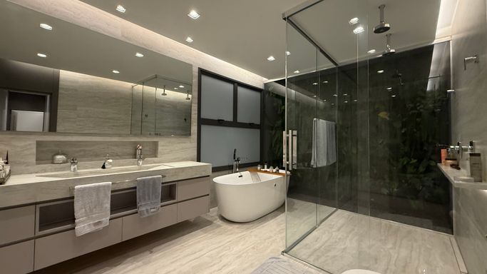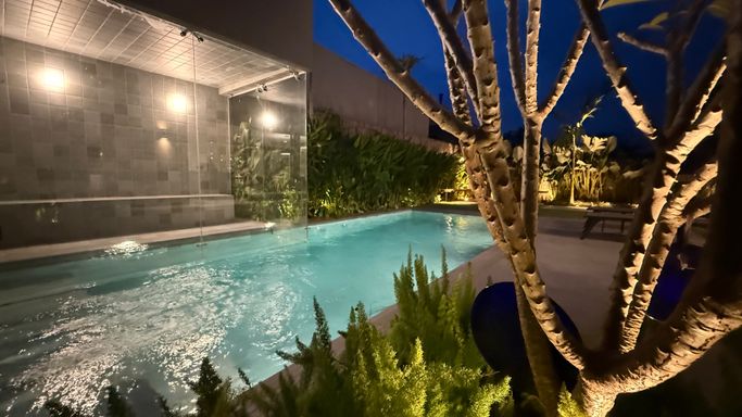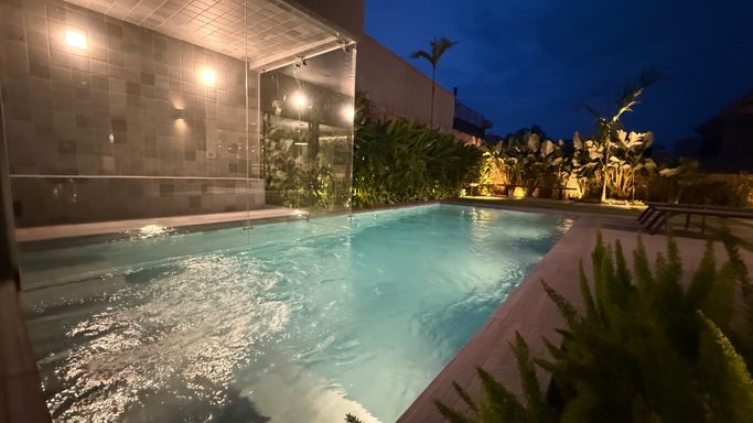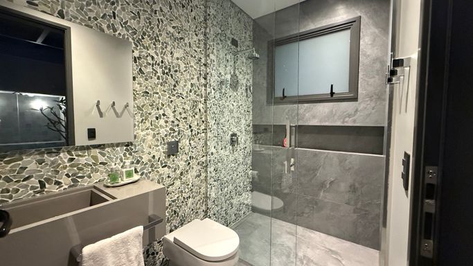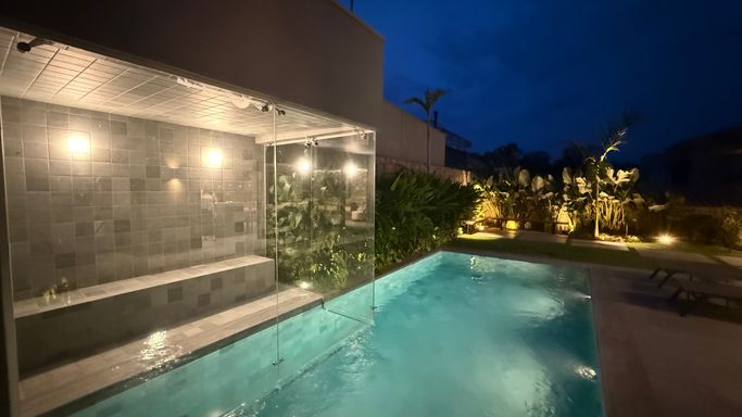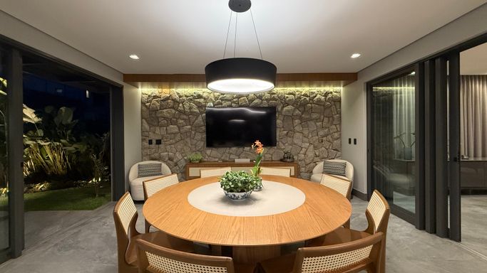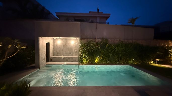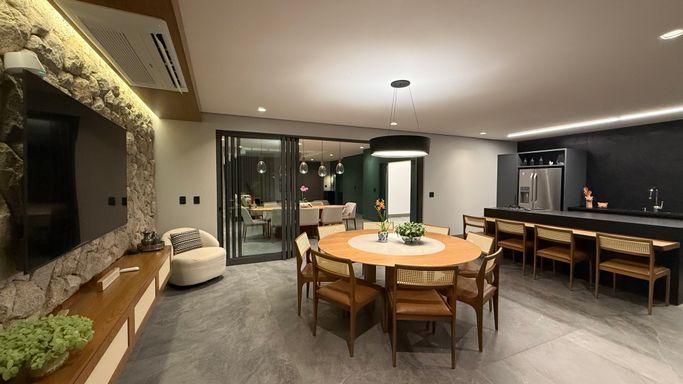 Casa possui armarios kitchens, uma area gourmet extremamente aconchegante e tudo integrado com uma piscina, sauna a vapor e um paisagismo impecavel com irrigaçao automatizada.