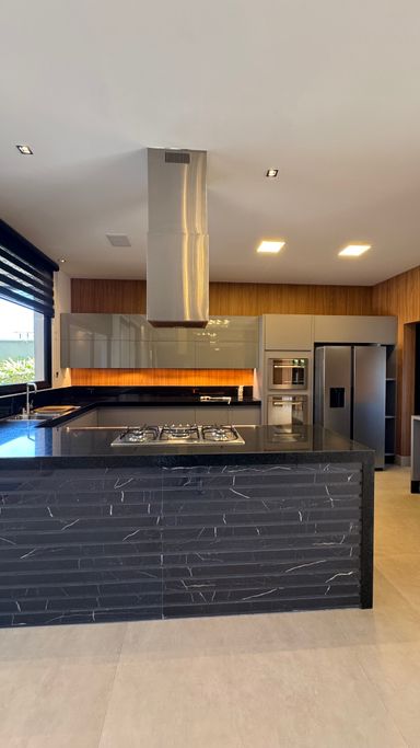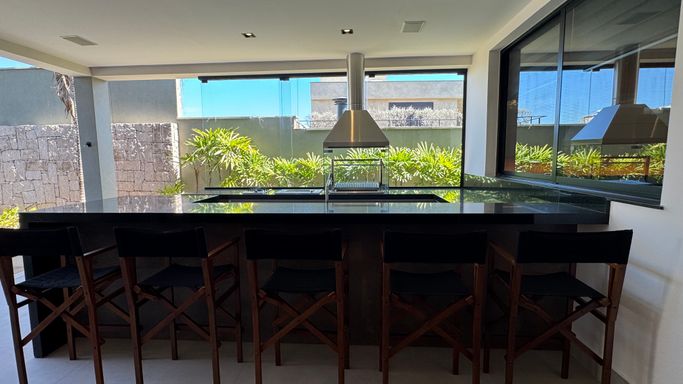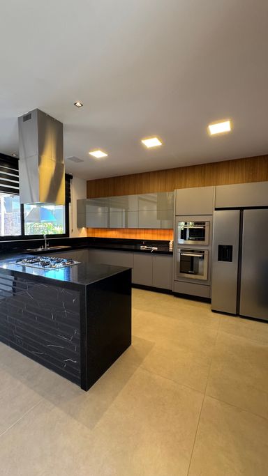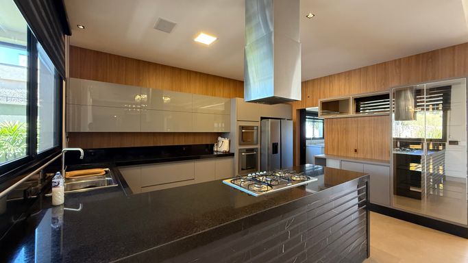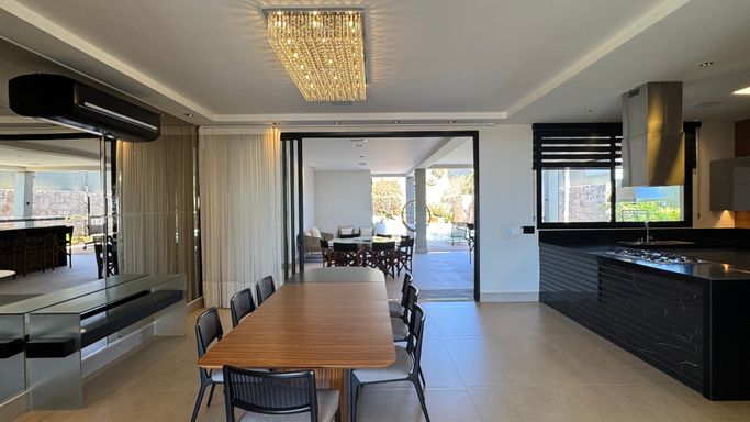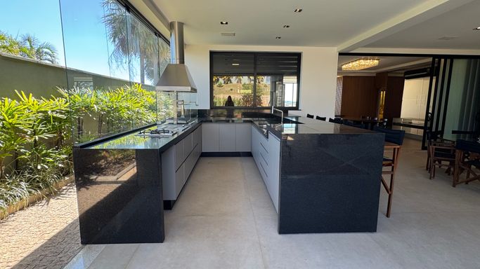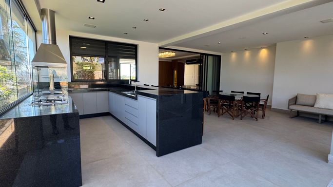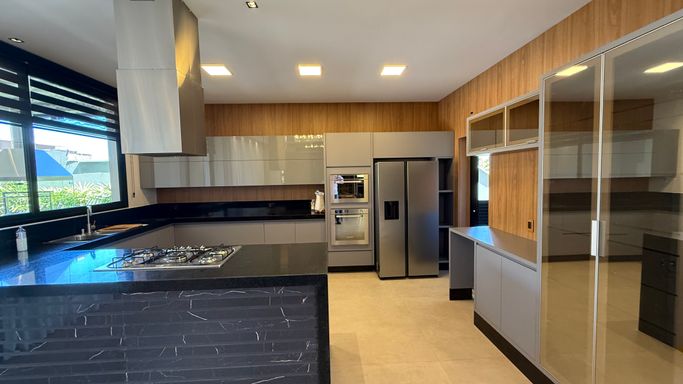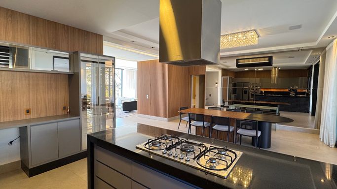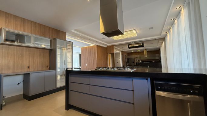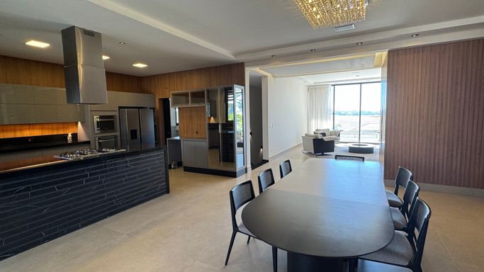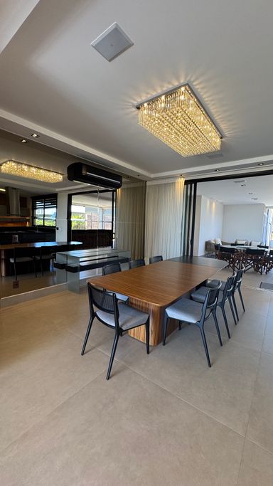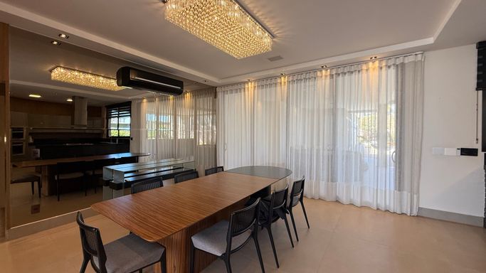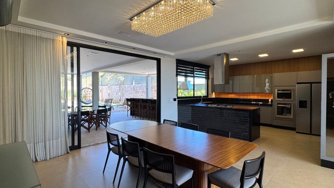 Sala de Jantar com mesa de jantar para 8 Lugares integradas com uma belíssima cozinha americana com eletrodomésticos de primeira linha.