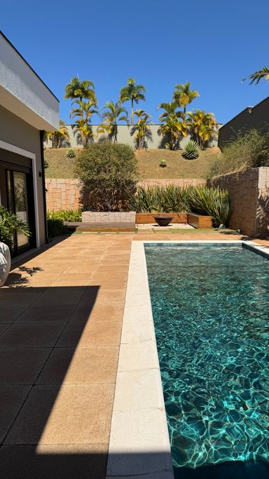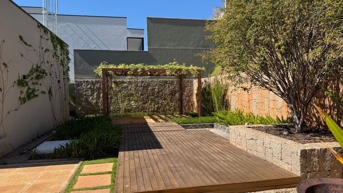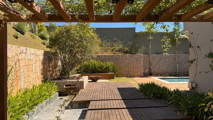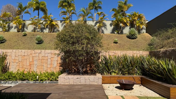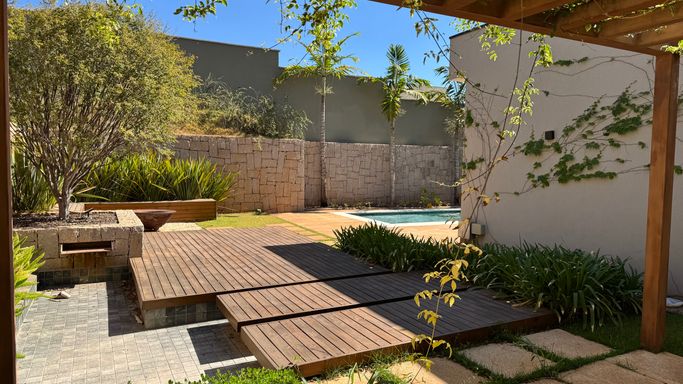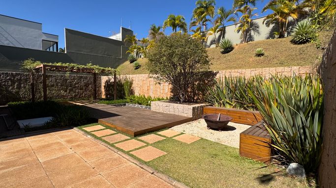 Espaço gramado, pergolado, espelho d’água com um bela Jabuticabeira e um delicioso espaço com Fire Place e Paisagismo Formado.