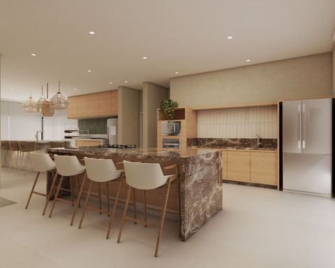 Com uma área construída de 734m², essa propriedade conta com 5 dormitórios, sendo todos suítes, lavabo, cozinha, lavanderia, despensa e varanda. Além disso, possui 3 vagas cobertas e 3 descobertas, elevador e uma incrível piscina com deck em madeira.